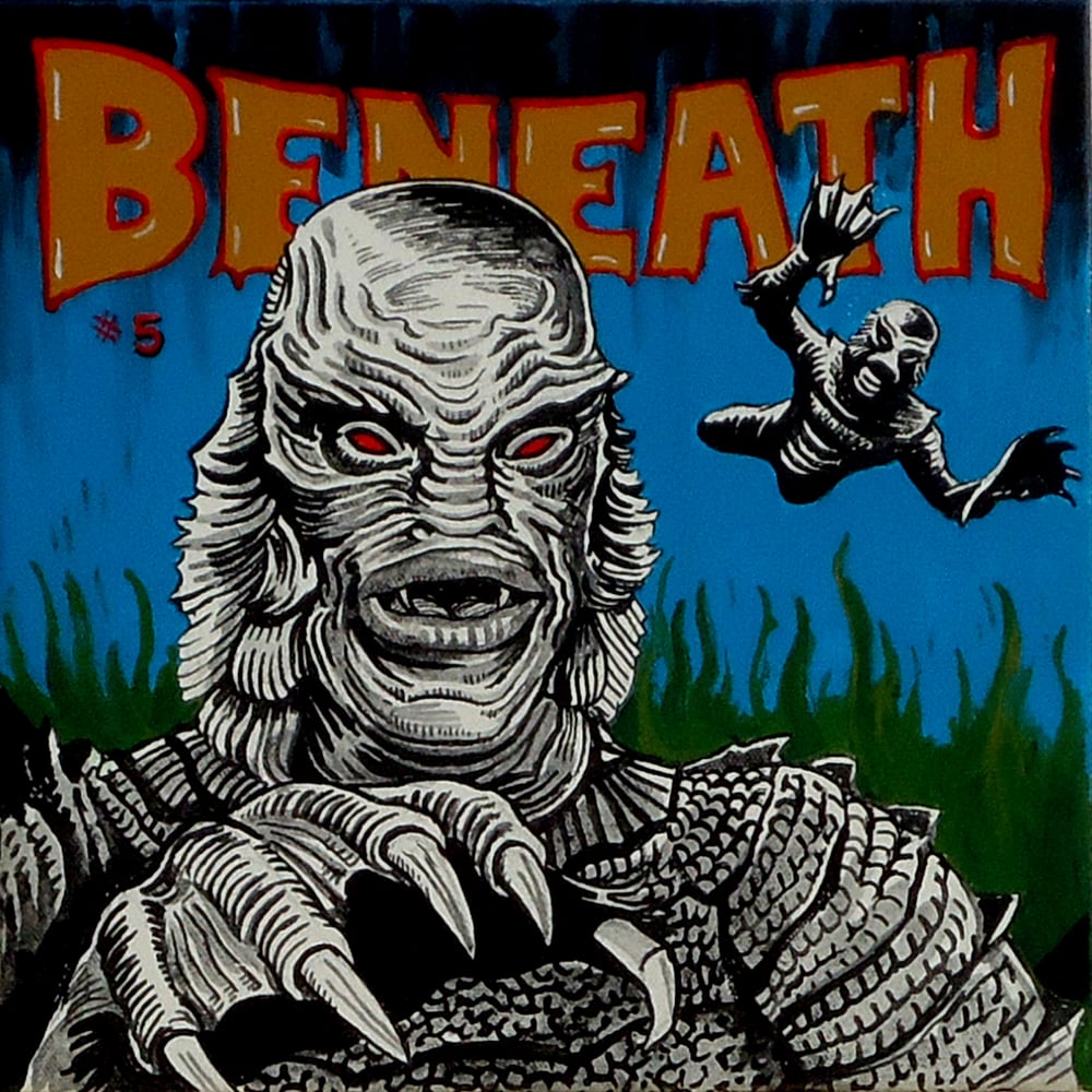 From the original painting by David Russell Talbott entitled "BENEATH" from his Universal Monster series, this professionally wrapped canvas print measures 8" x 8", 7/8" deep and is signed by the artist. The piece features the Gillman from Creature of the Black Lagoon. For more about the art of Pulpcore, go to www.davidrusselltalbott.com.